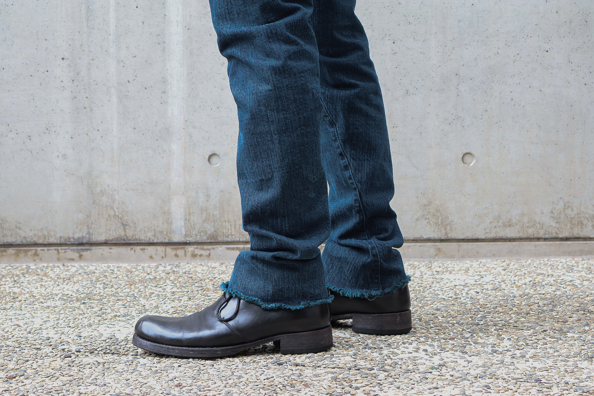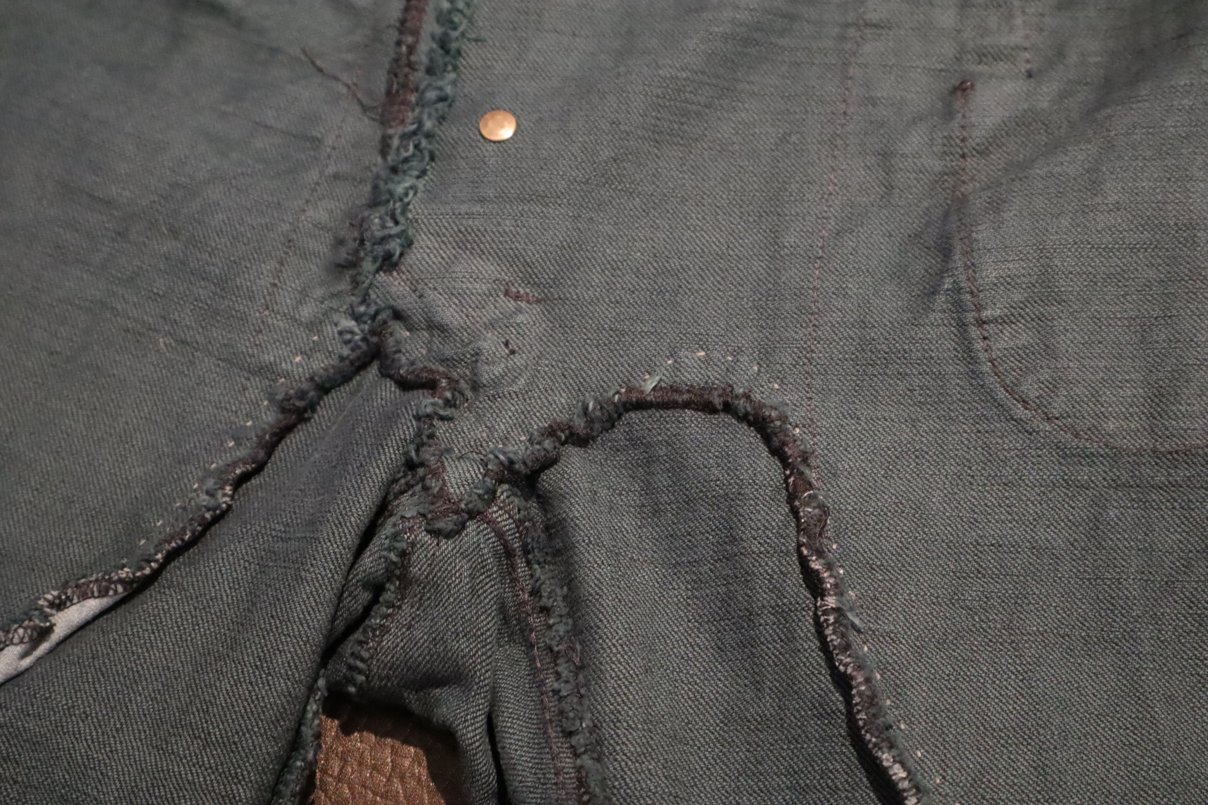 全体的な色落ちを進行させたウォッシュド加工。これからシワやアタリをじっくり加えていきましょう。