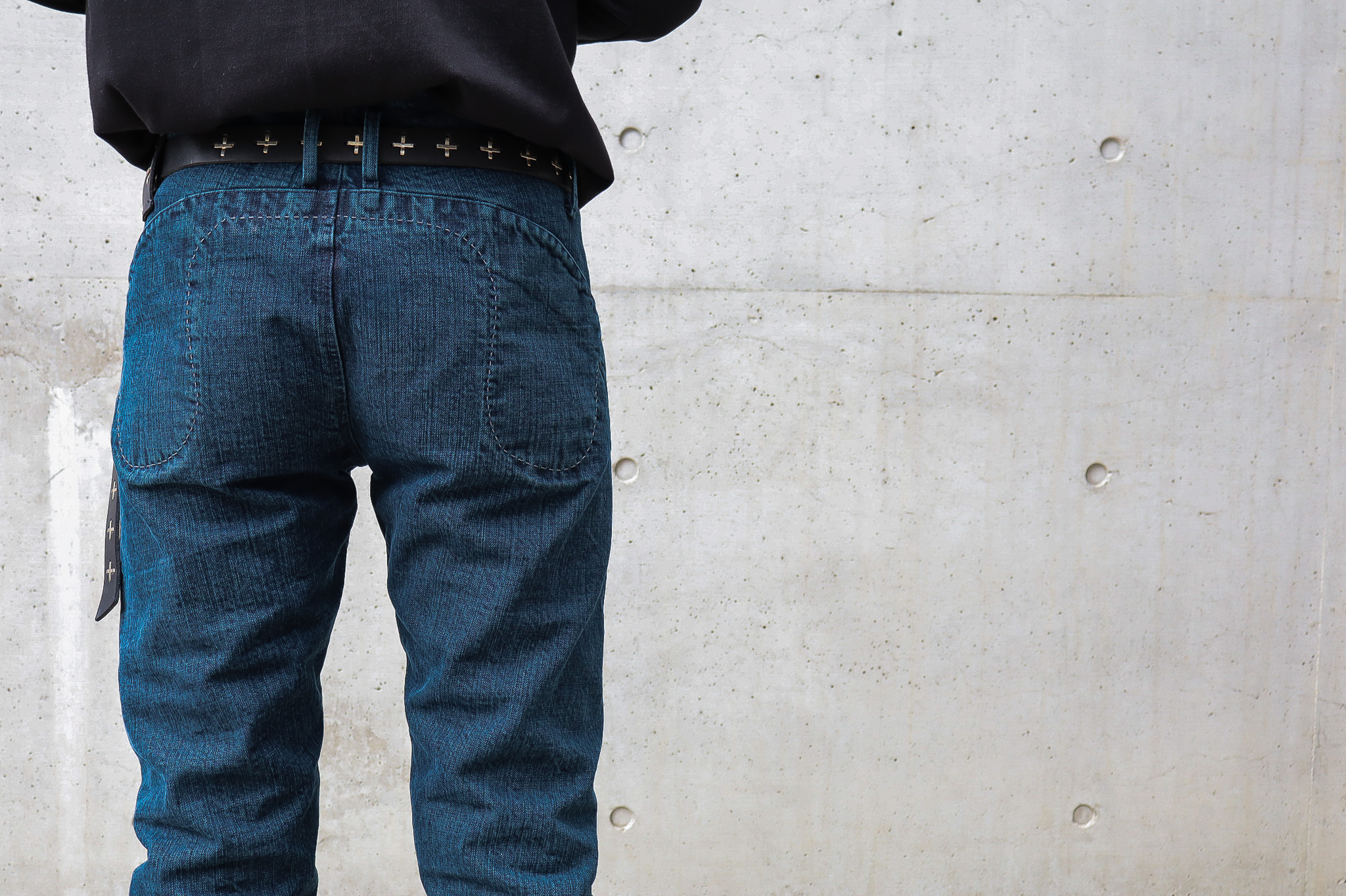 腰回りのデザインは拘りどころ。バックヨークの流れを活用し、前後にポケットを配置しています。