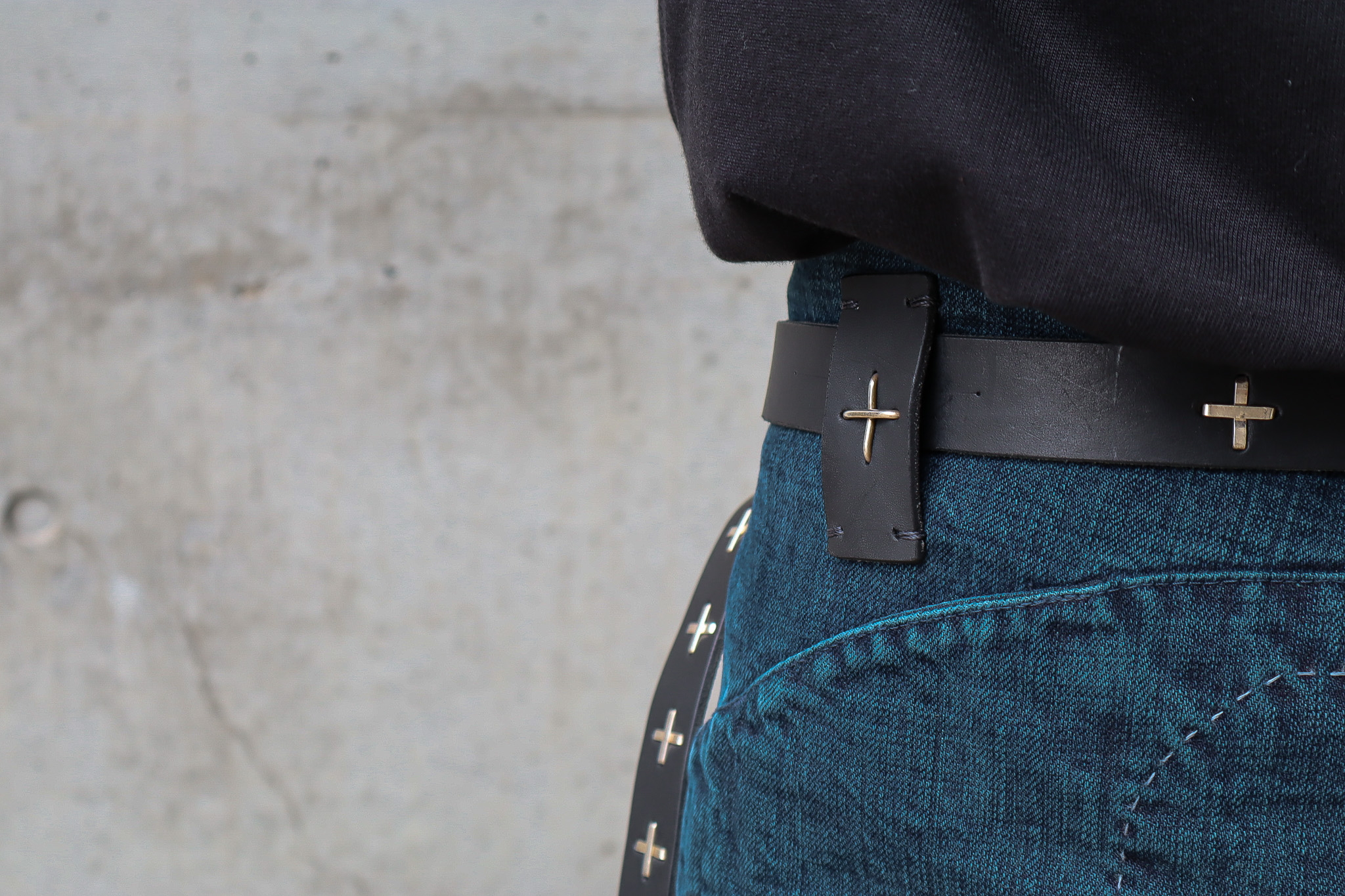 レザーパッチはブラックに”+”のステイプル。後ろにベルトも通せます。